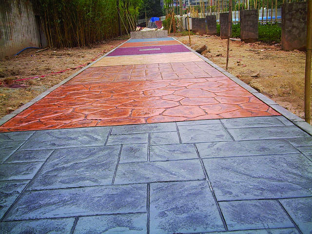 在壓模地坪上添加色彩是進一步表現美學設計的一種方式,不僅強調設計的細節,還同時為混凝土著色以突出周圍的景觀。為了表面能夠更干凈,壓模地坪通常將混凝土密封以保護顏色,但密封劑的壽命有限,但是平均需要每兩年左右重新密封一次。用混凝土密封劑涂刷覆蓋整個模壓混凝土的表面。如果現有污漬幾乎無法除去,并且使用的是淺色涂層,可以用含有小蘇打水和溫水的混合物中和酸漬。然后在污漬區域上涂抹一層新的混凝土密封劑,以將污漬的顏色覆蓋。用刷子均勻涂抹密封劑,確保所有紋理區域都被涂刷到。